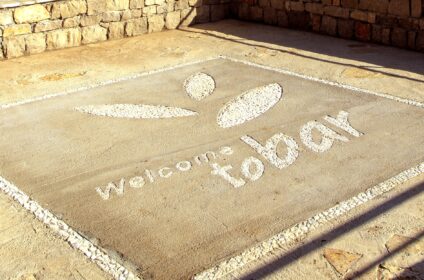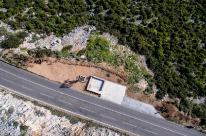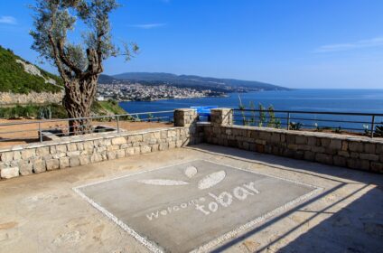 Magnificent view of the ragged coastline of Bar with attractive tourist resorts and the azure Adriatic Sea.