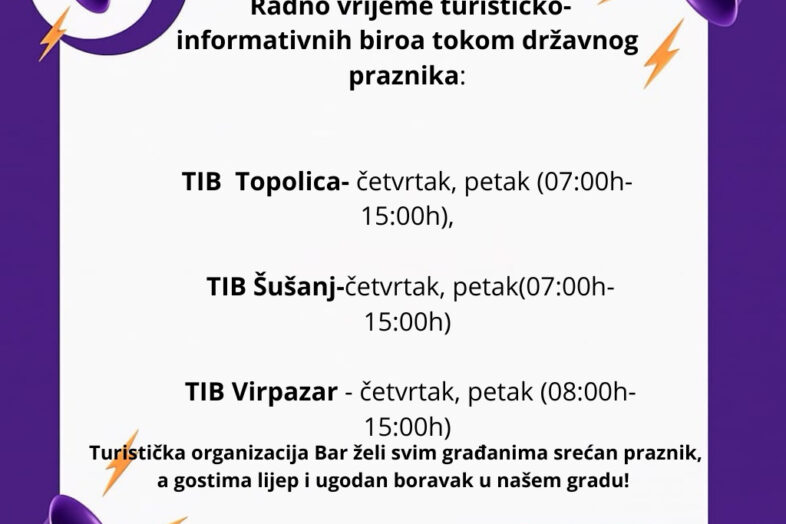 Turistička organizacija Bar obavještava turiste i građane da će turističko-informativni biroi na teritoriji opštine Bar povodom državnog praznika kulture – Njegoševog dana, u četvrtak i petak, 13. i 14. novembra,
