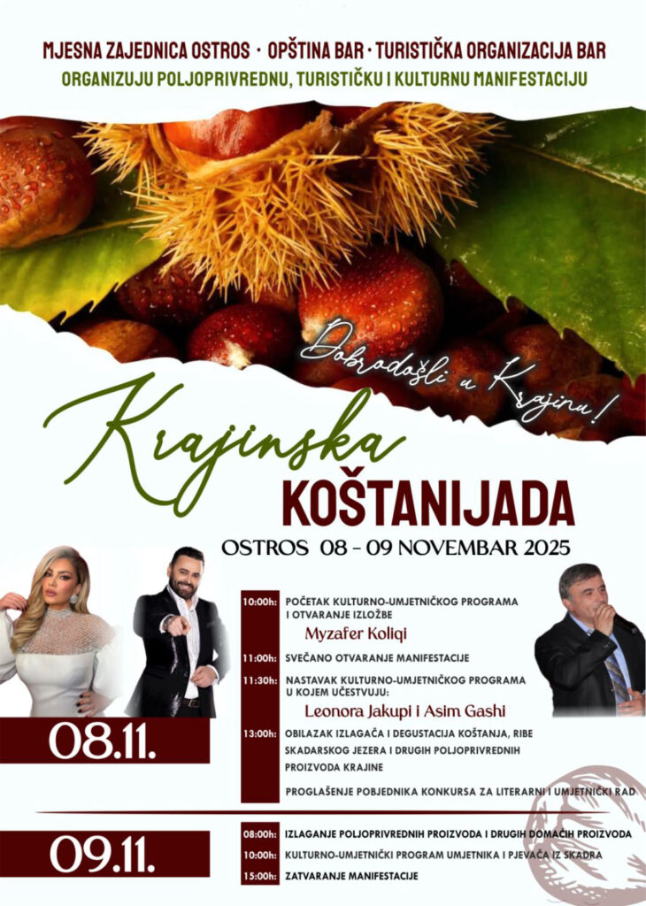 Tradicionalna manifestacija “Krajinska Koštanijada“ biće održana ovog vikenda, 8. i 9. novembra, u Ostrosu. Organizator manifestacije je MZ Ostros, pod pokroviteljstvom Opštine Bar i Turističke organizacije Bar.
